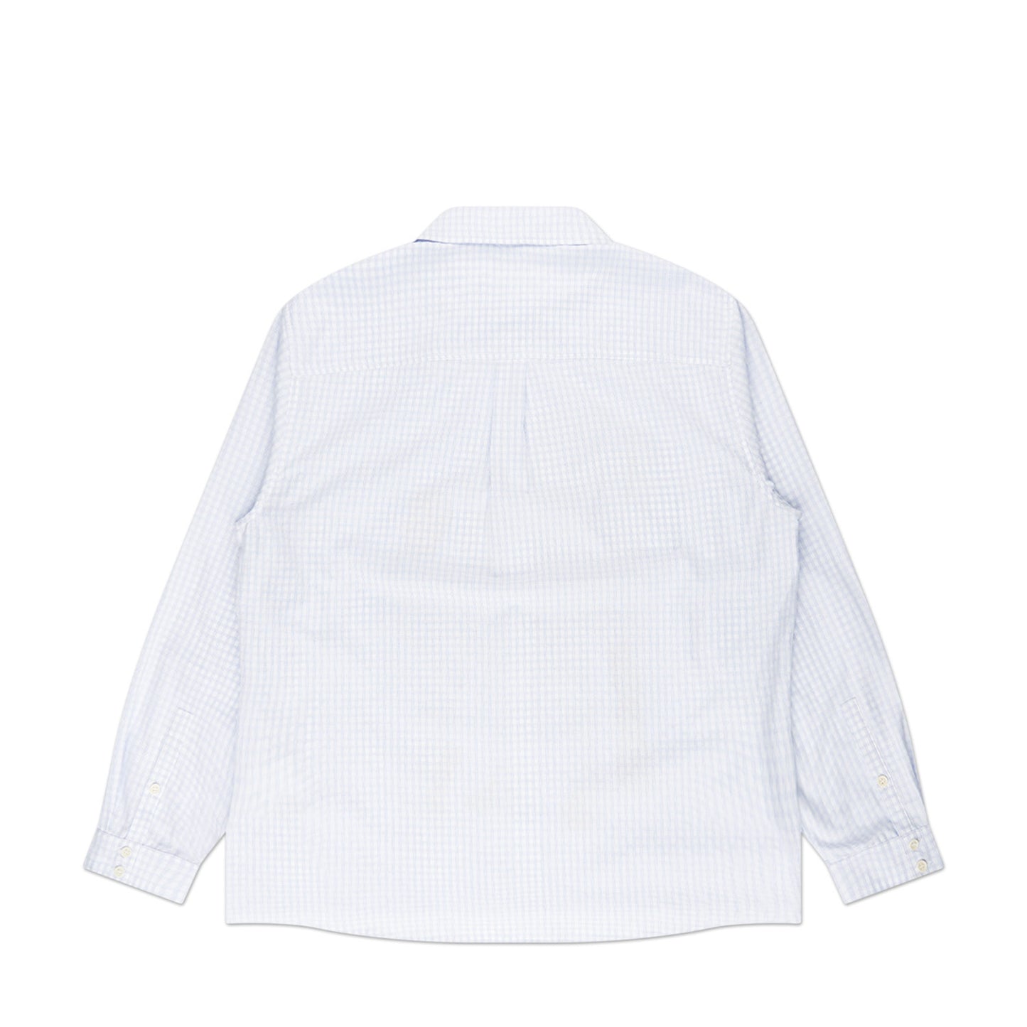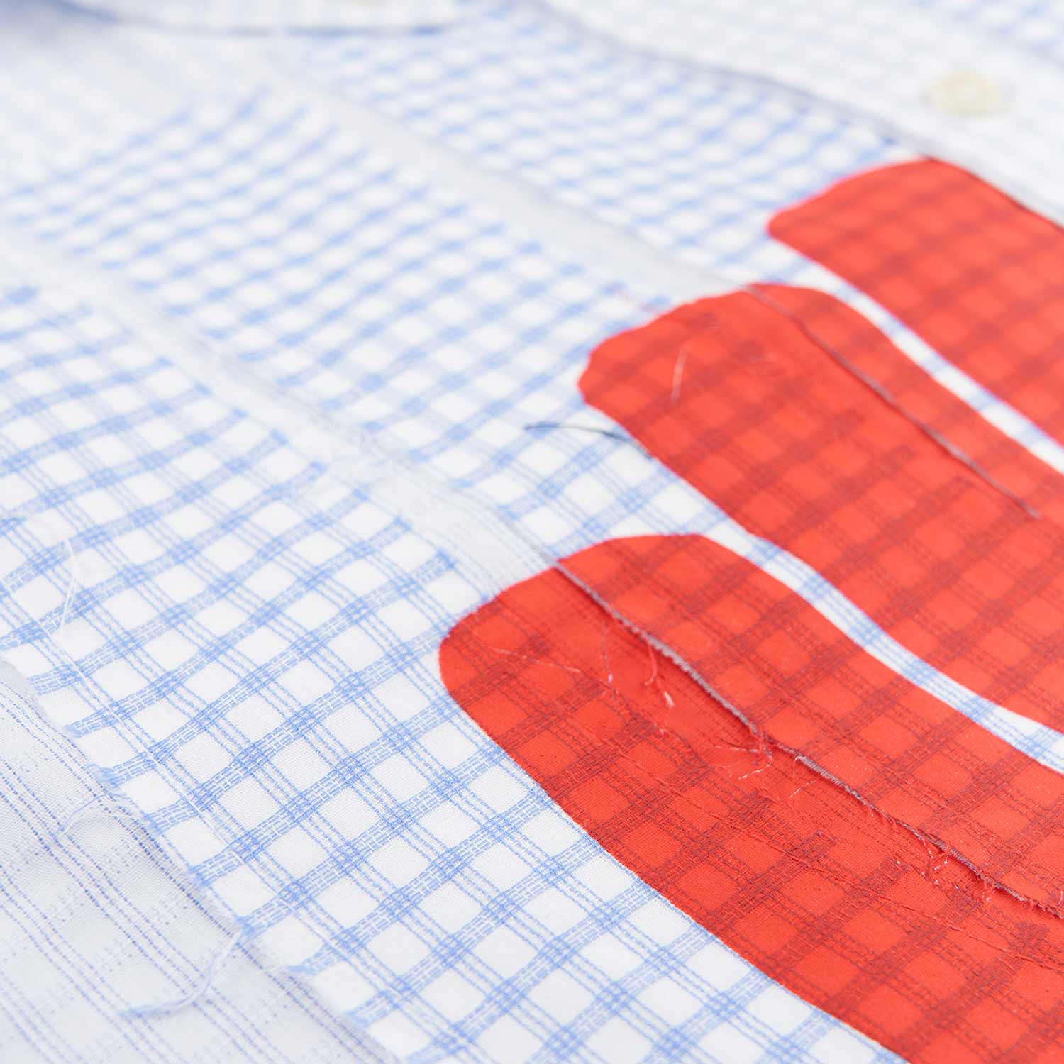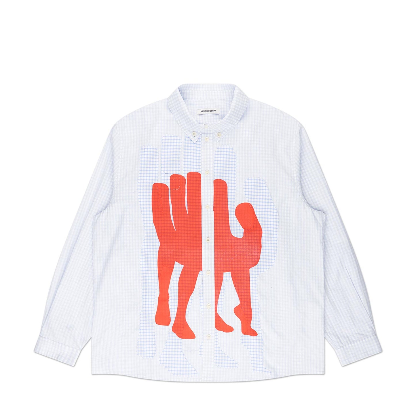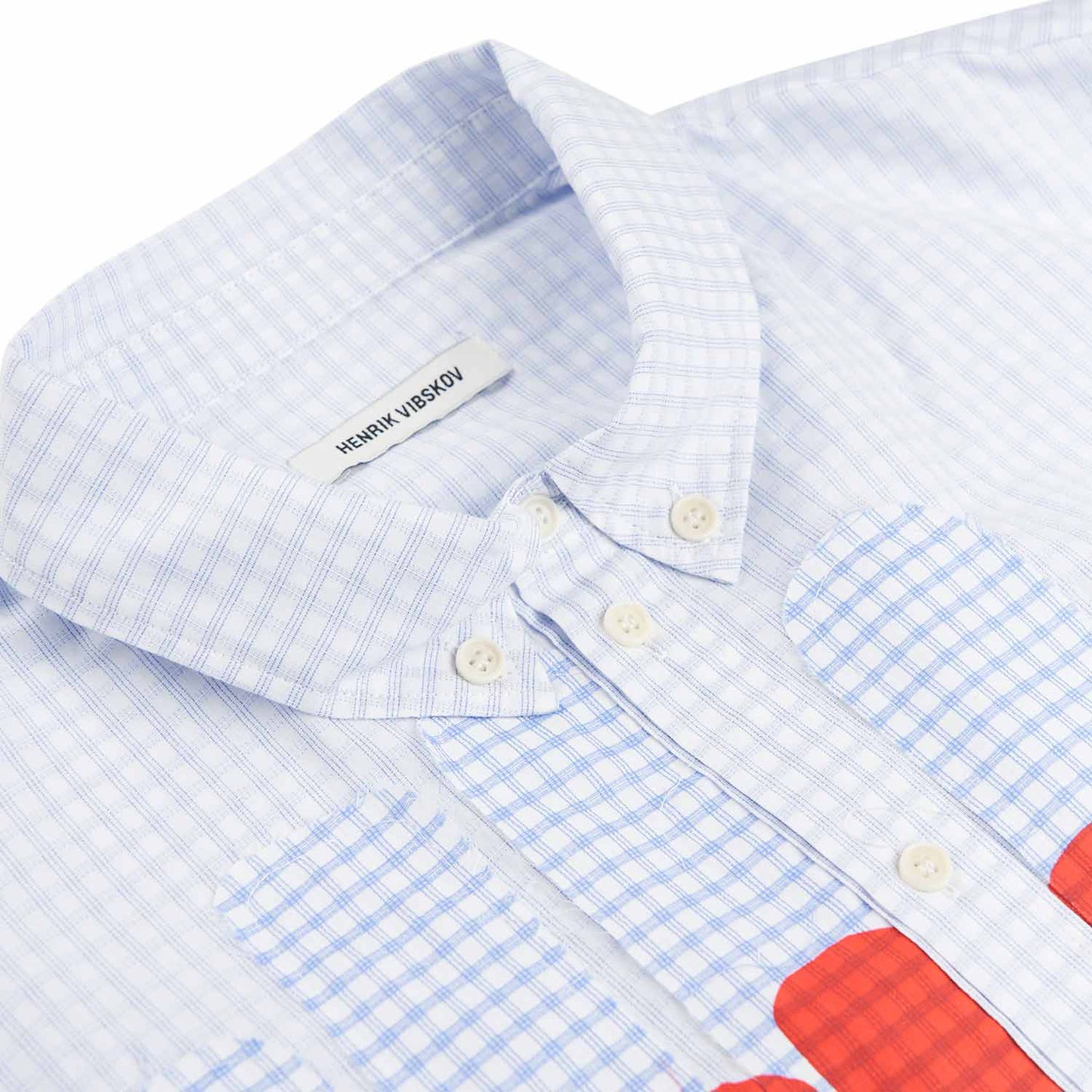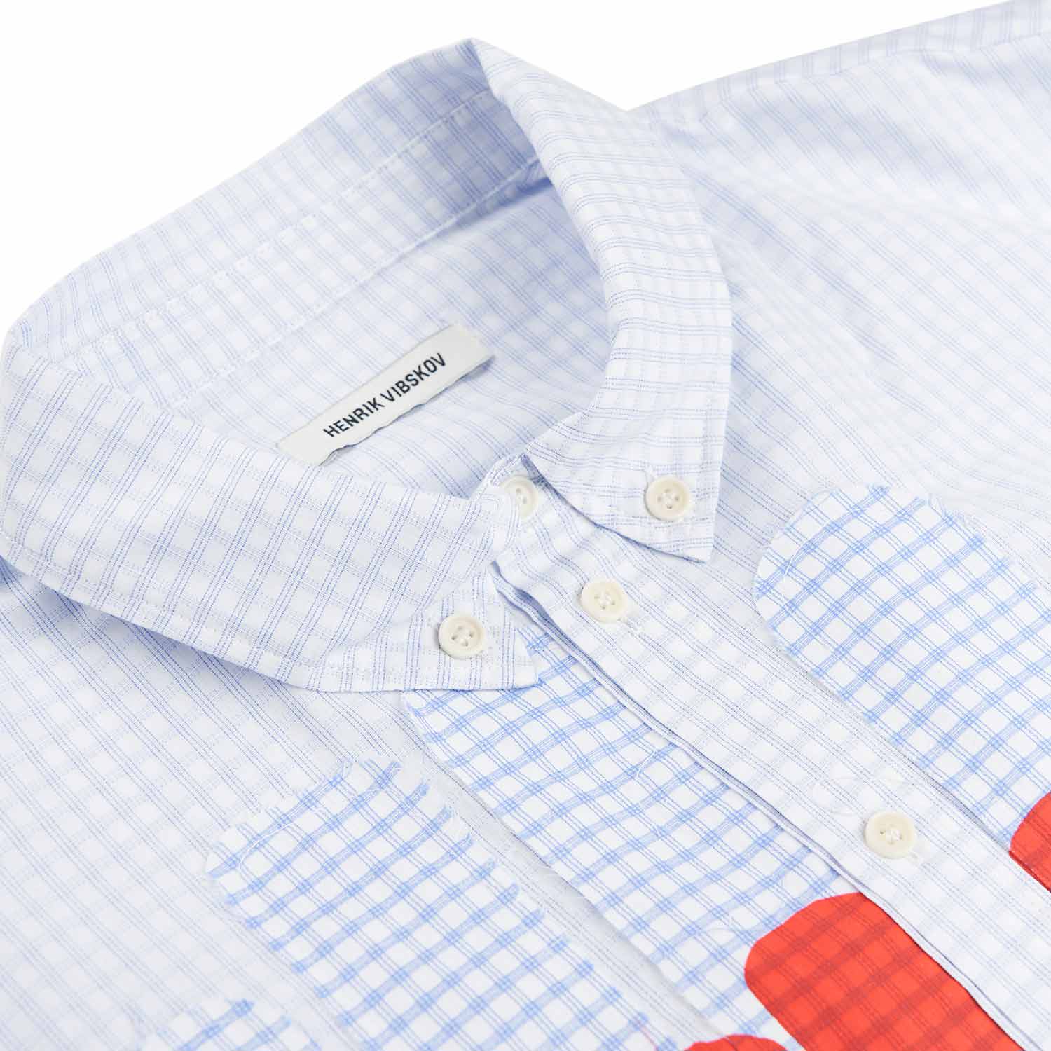 block shirt aus der henrik vibskov herbst / winter 24 kollektion. das hemd hat einen knöpfbaren kragen und einen roten druck auf der vorderseite.