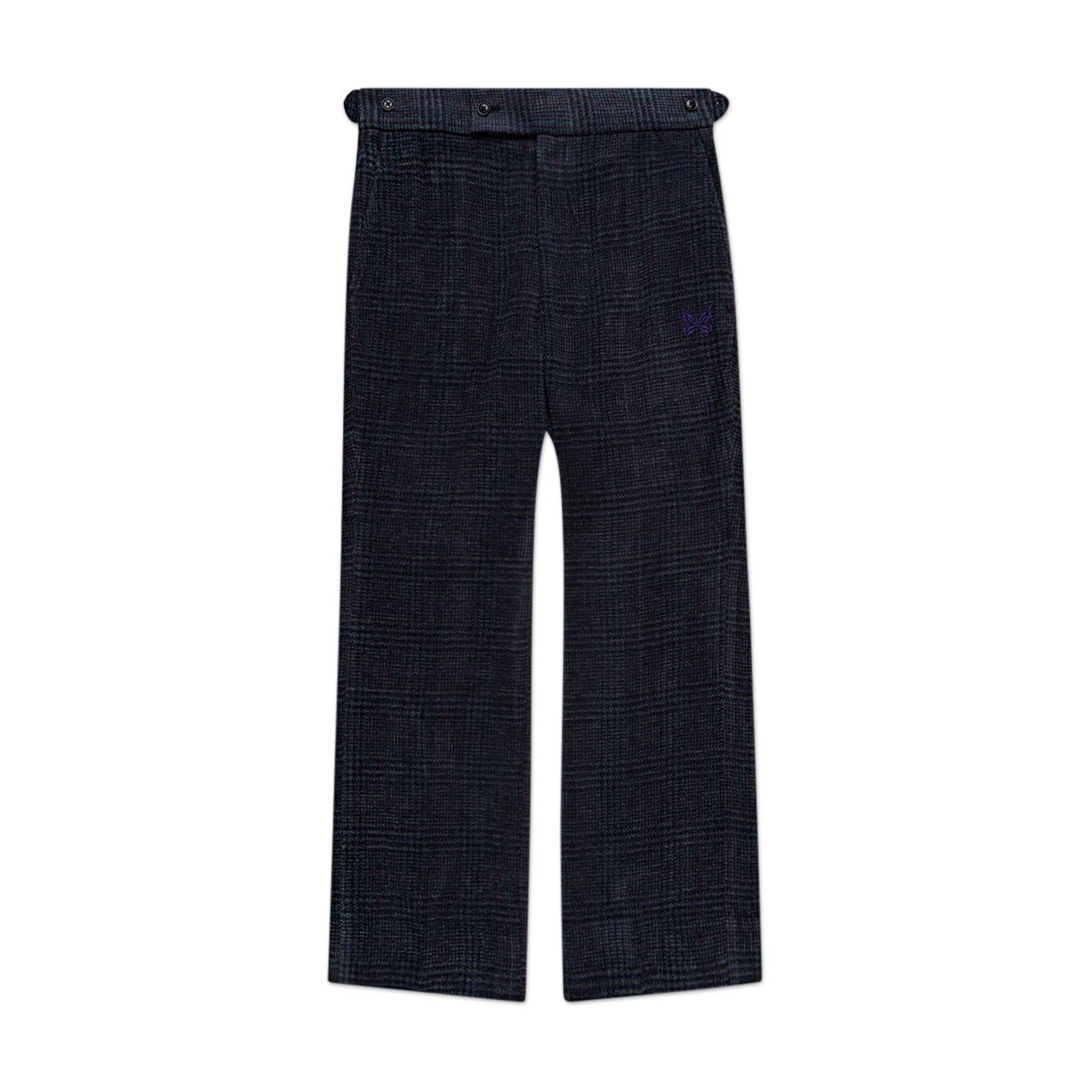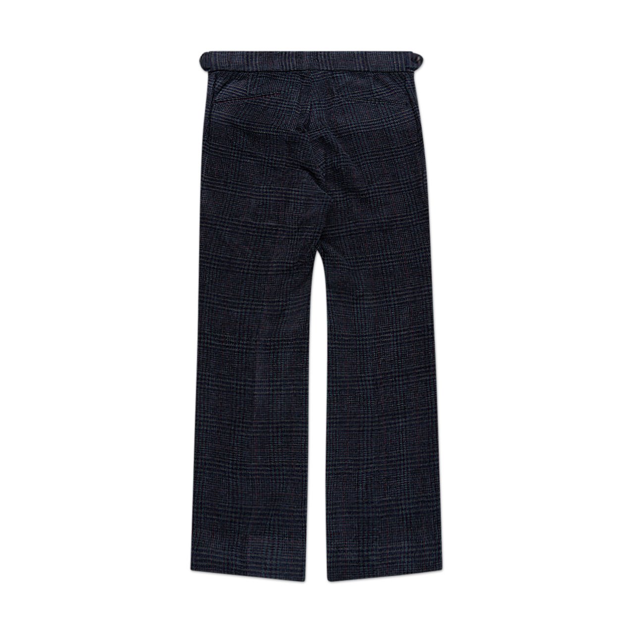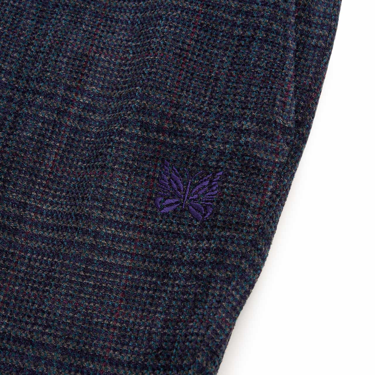 formelle hose in marineblauem karomuster von needles. mit seitlicher lasche an der taille und lila schmetterlingslogostickerei.
