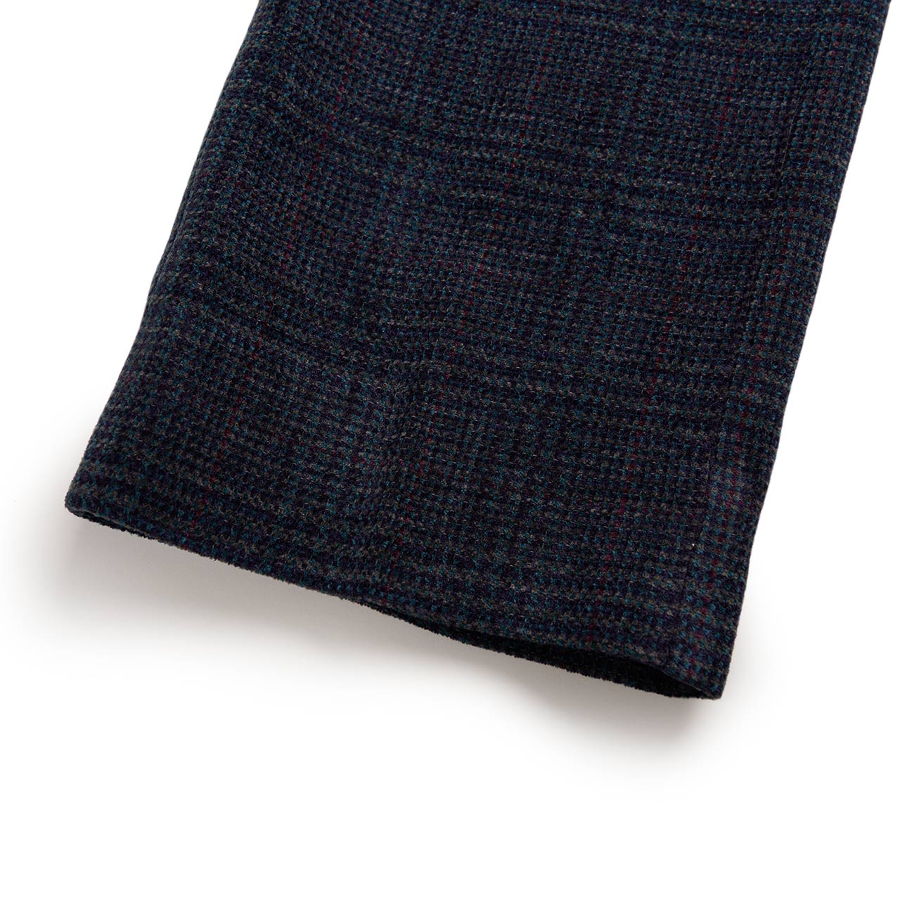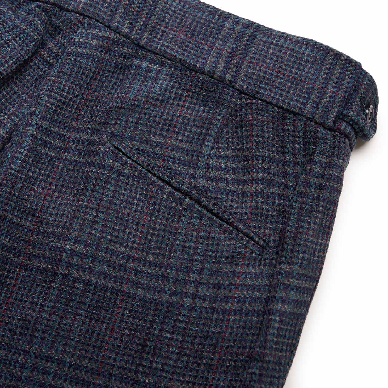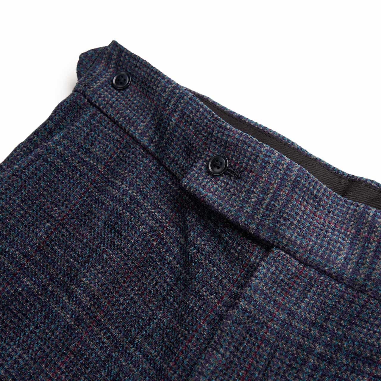 formelle hose in marineblauem karomuster von needles. mit seitlicher lasche an der taille und lila schmetterlingslogostickerei.
