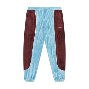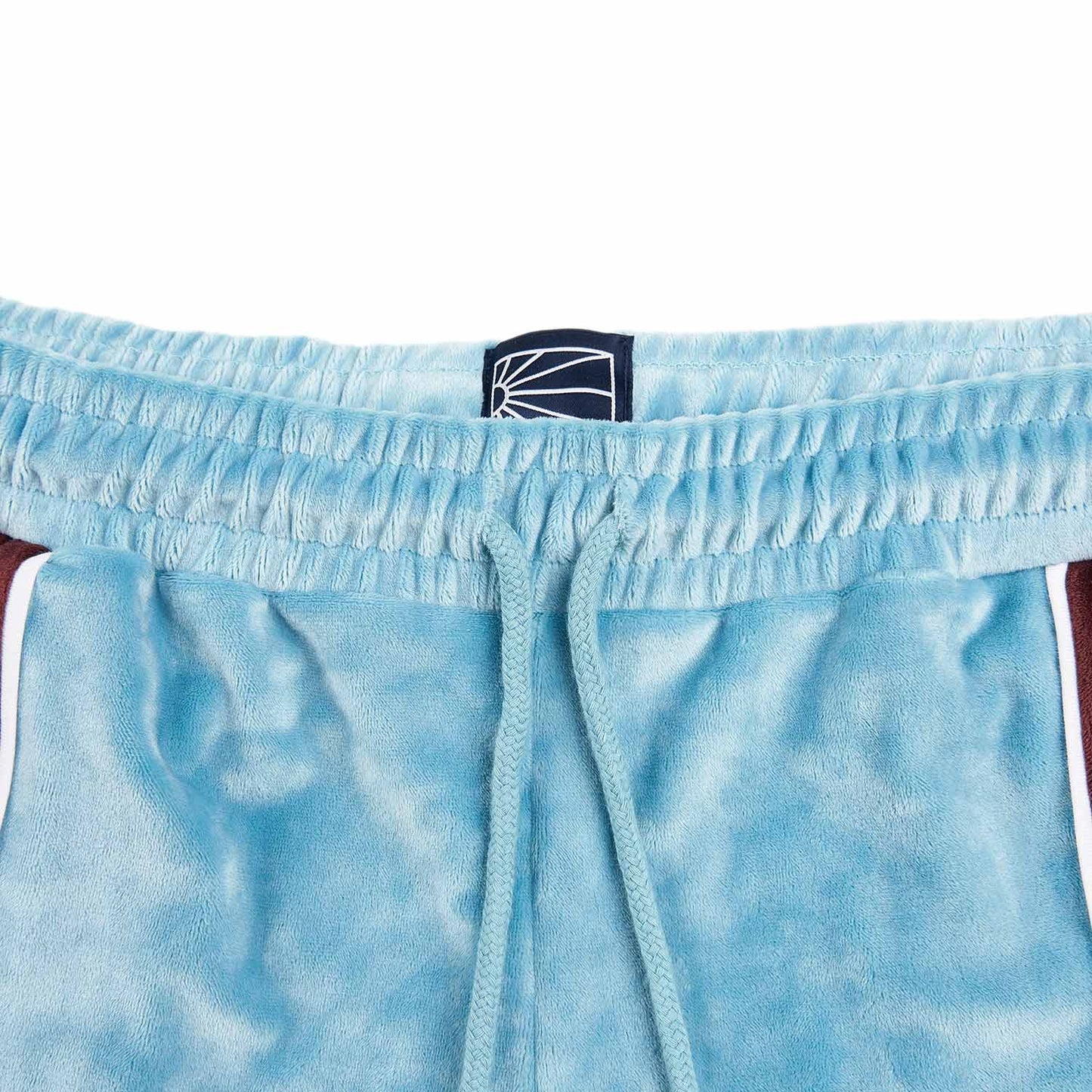 diese velours-trainingshose aus der rassvet aw23-kollektion hat rostfarbene seitenteile mit paspeln an den beinen. rassvet-stickerei am oberen linken bein. zwei seitentaschen auf der vorderseite.