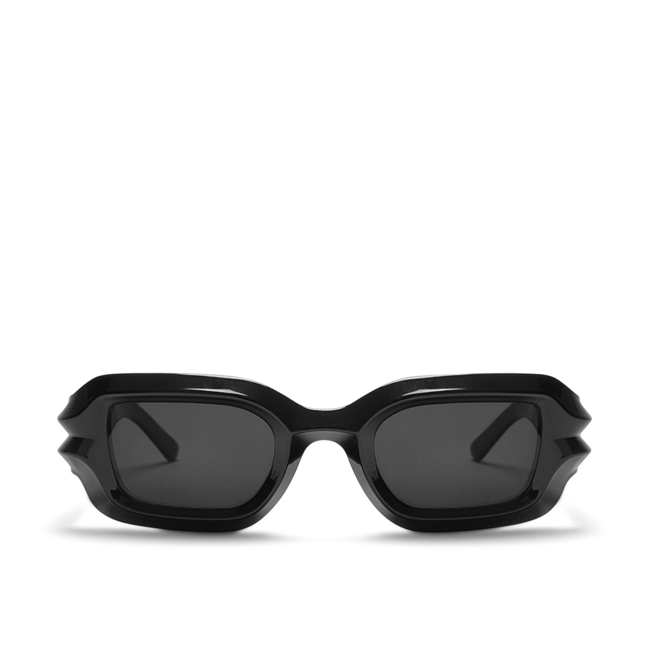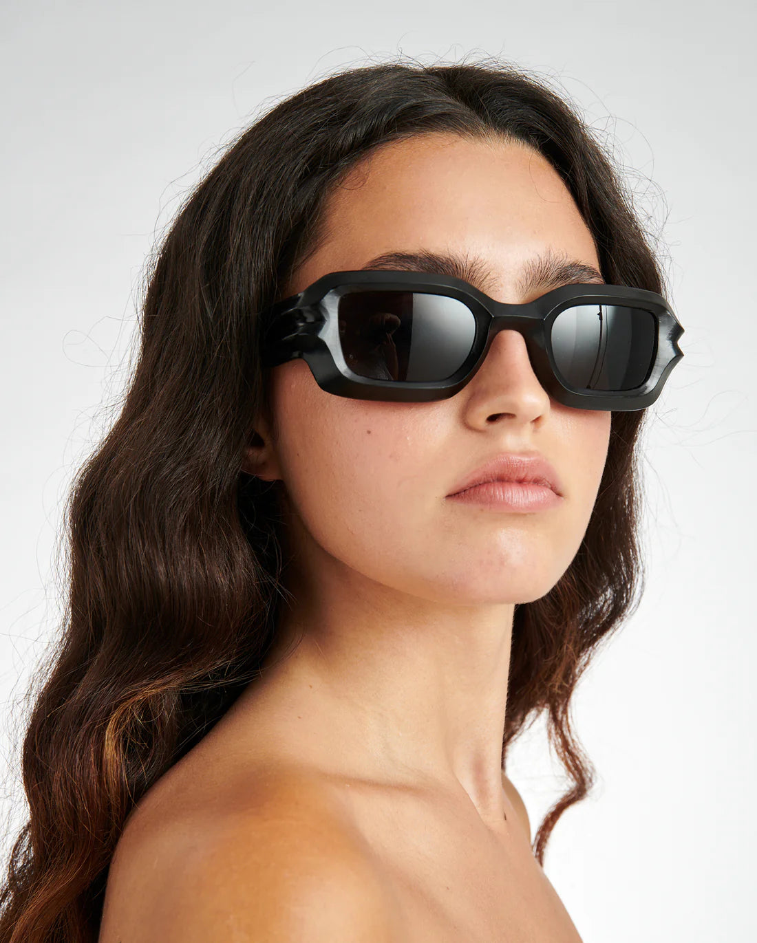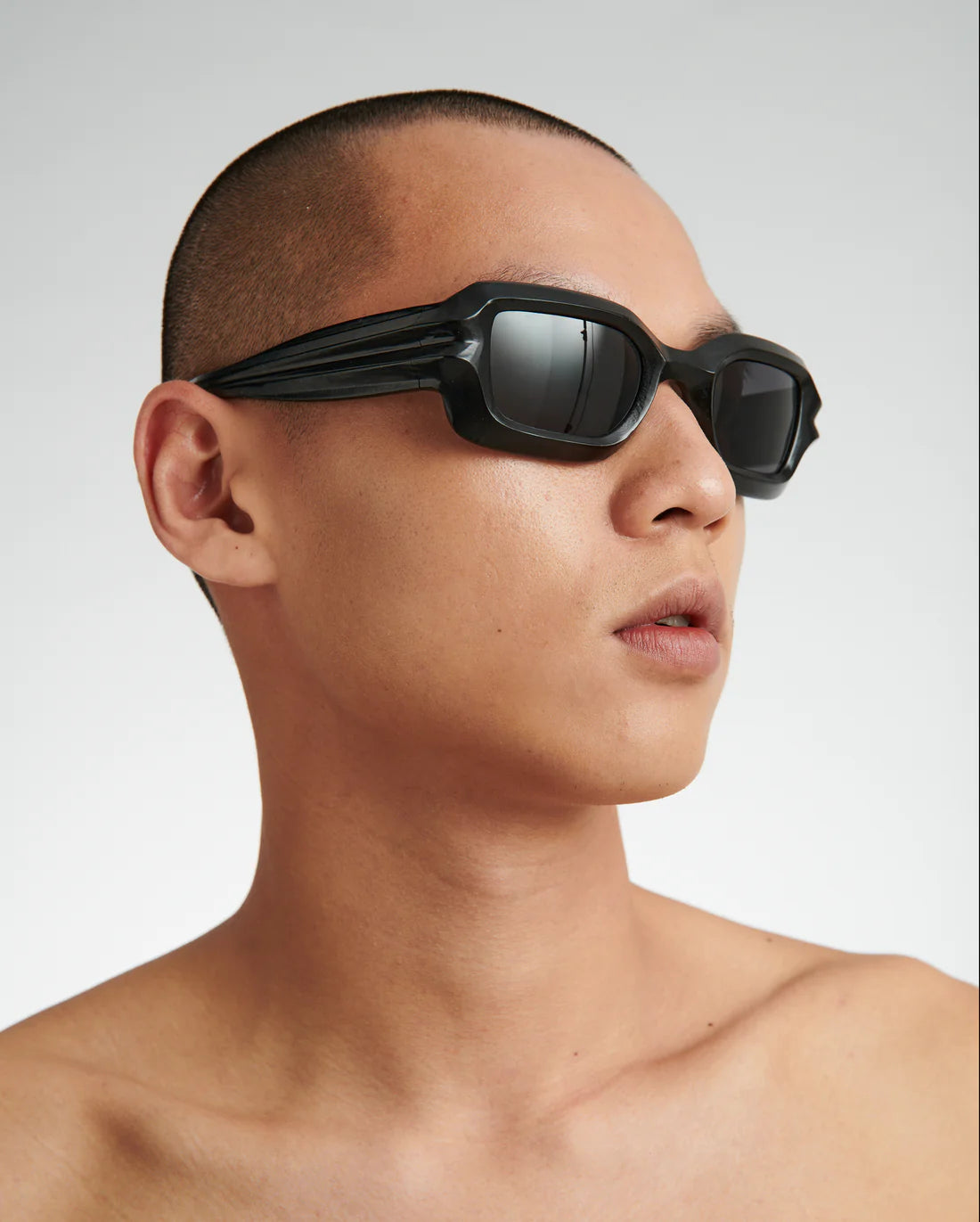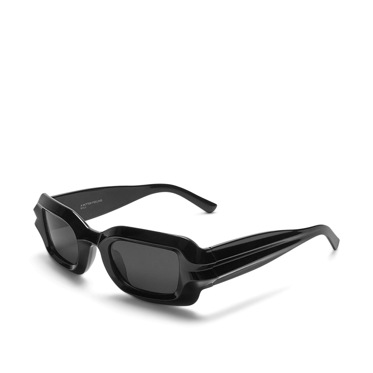 unisex sunglasses by a better feeling. features double ridge temples and black polarized lenses, offering full uv protection.