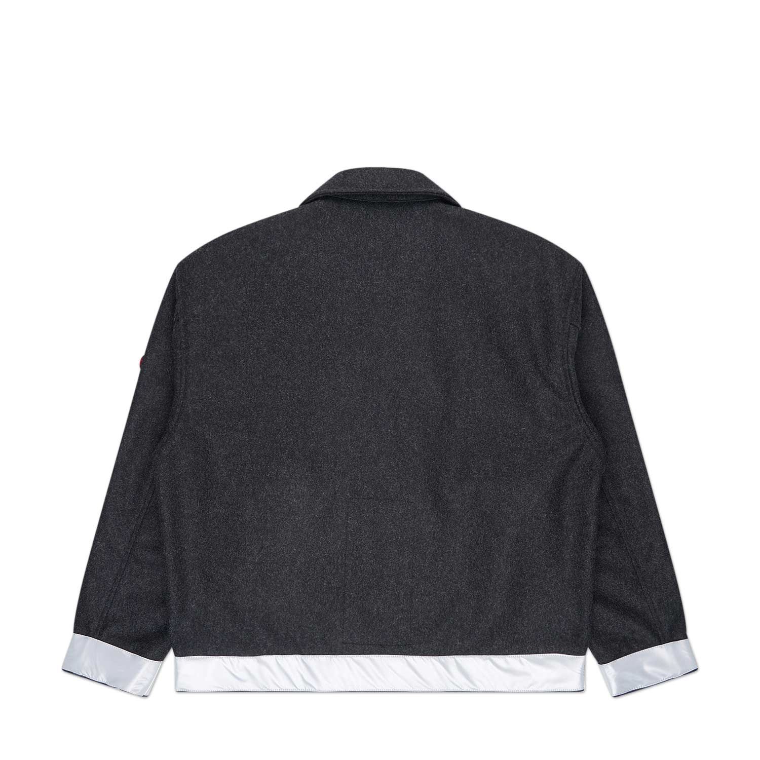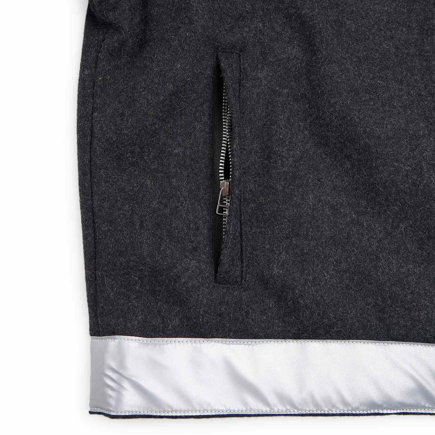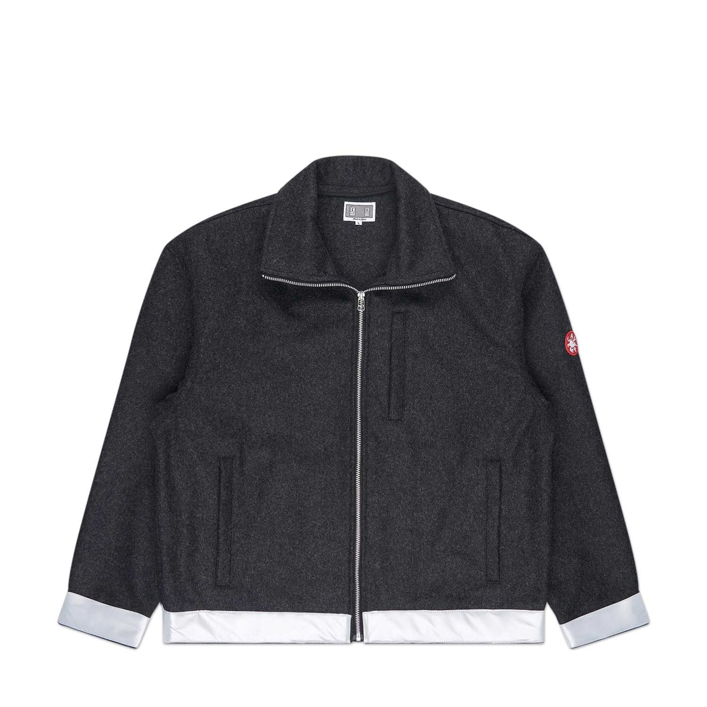 reflect wool zip jacket from the spring / summer 24 collection. the jacket features reflective stripes on cuffs and hem and a cav empt logo patch on the left sleeve.