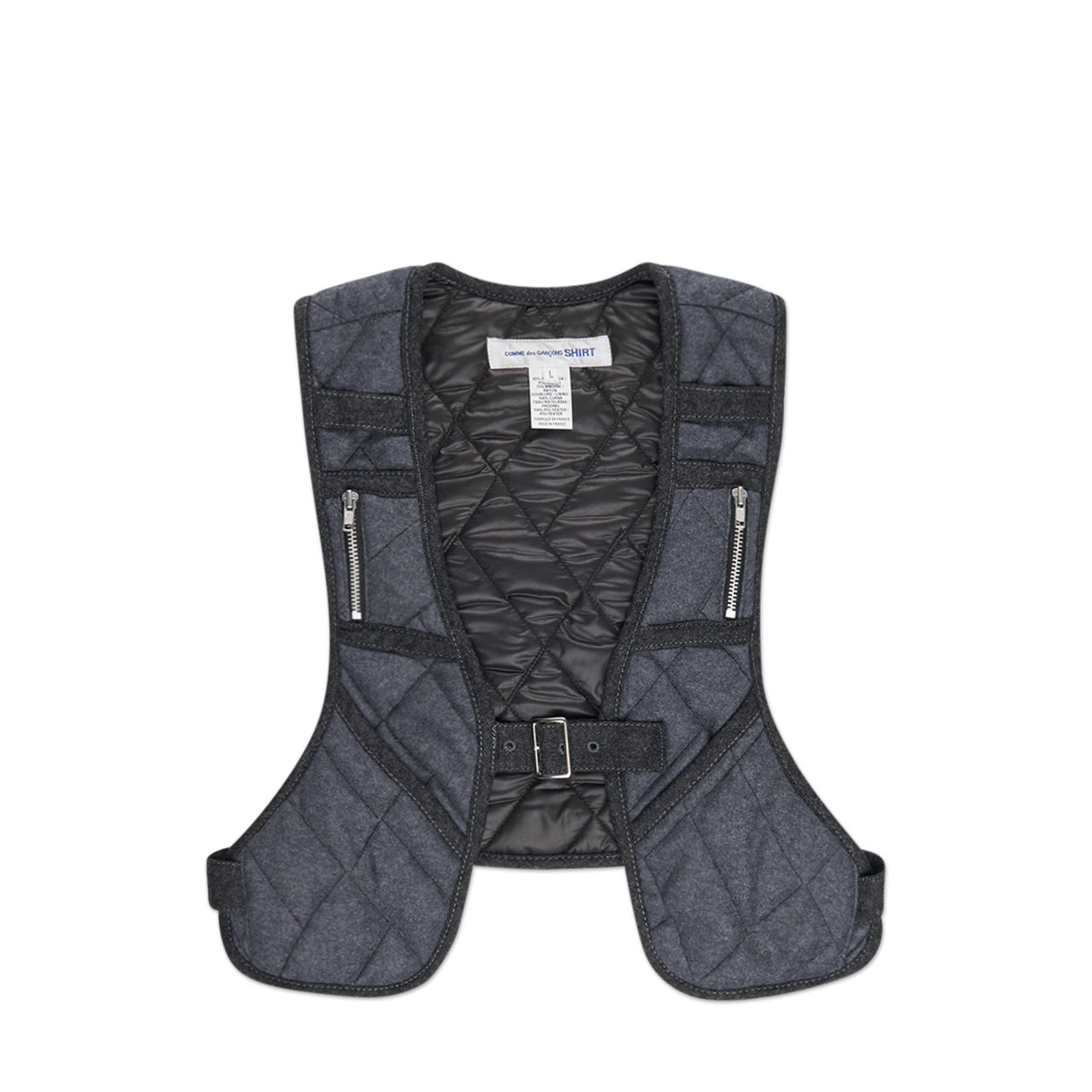 the comme des garçons shirt woven vest comes with zip pockets for storing small items.