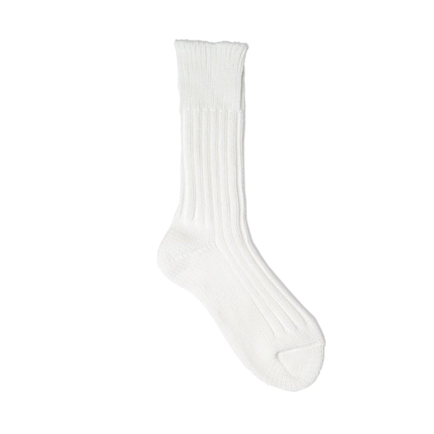 heavy, thick rib cotton socks by decka in a white colorway. socks come rolled up in a custom made paper case.