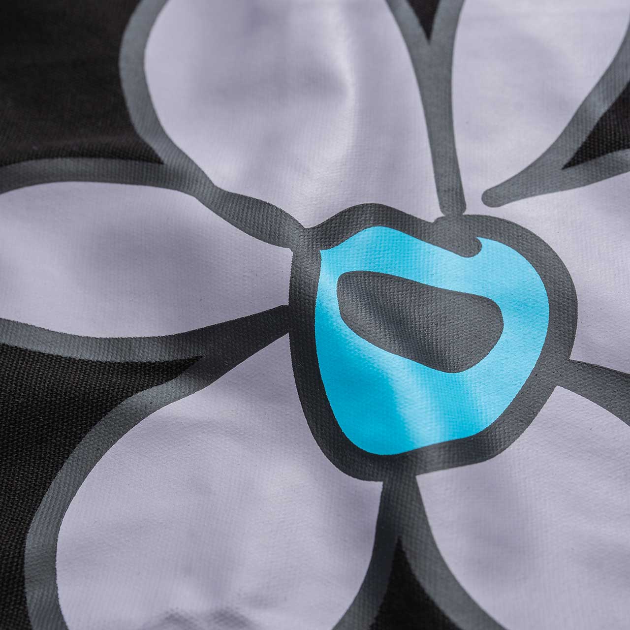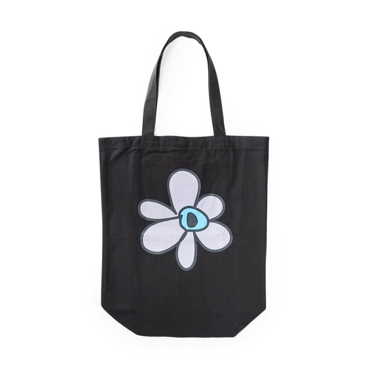 large tote bag with a heavy canvas construction, featuring logo and signature flower motif prints.