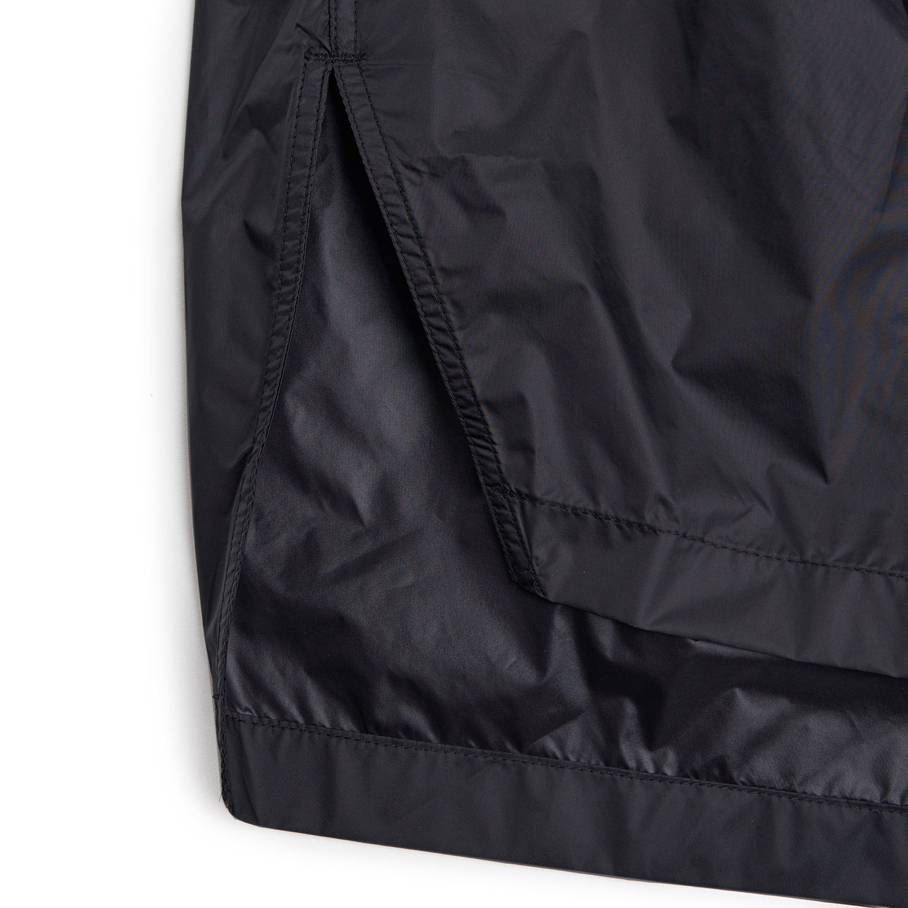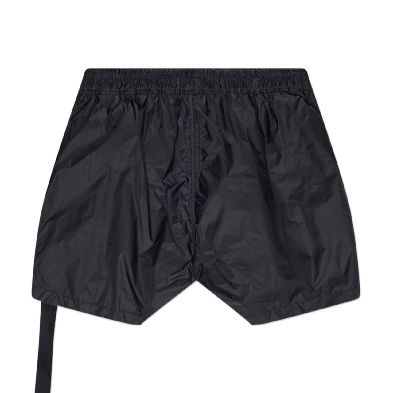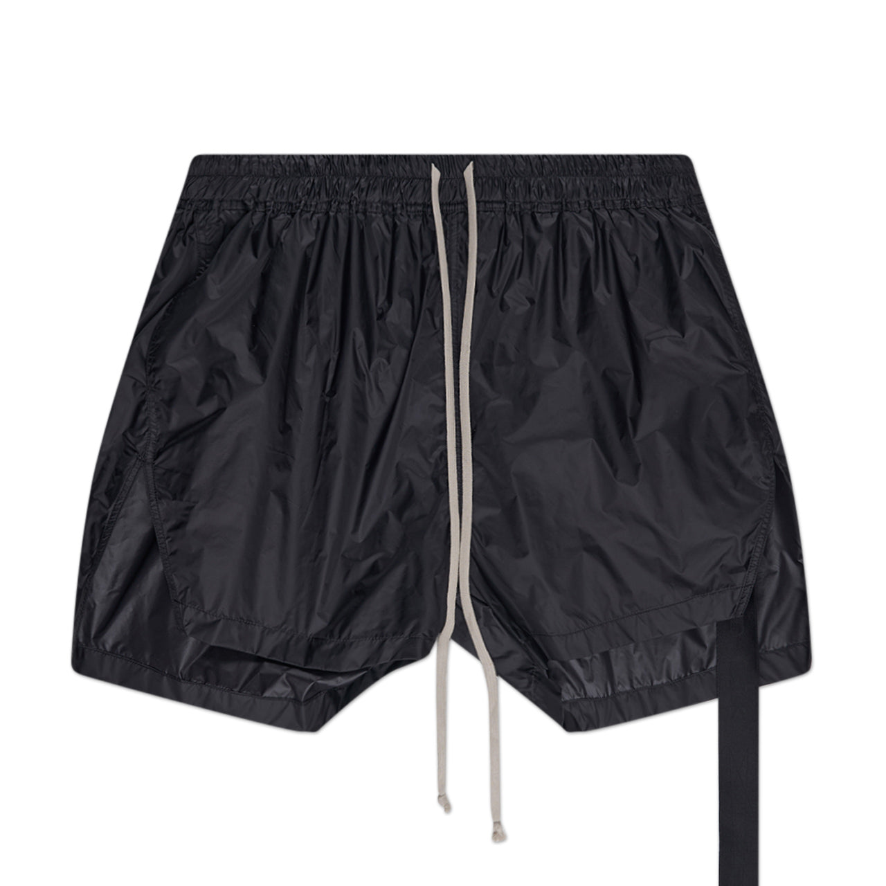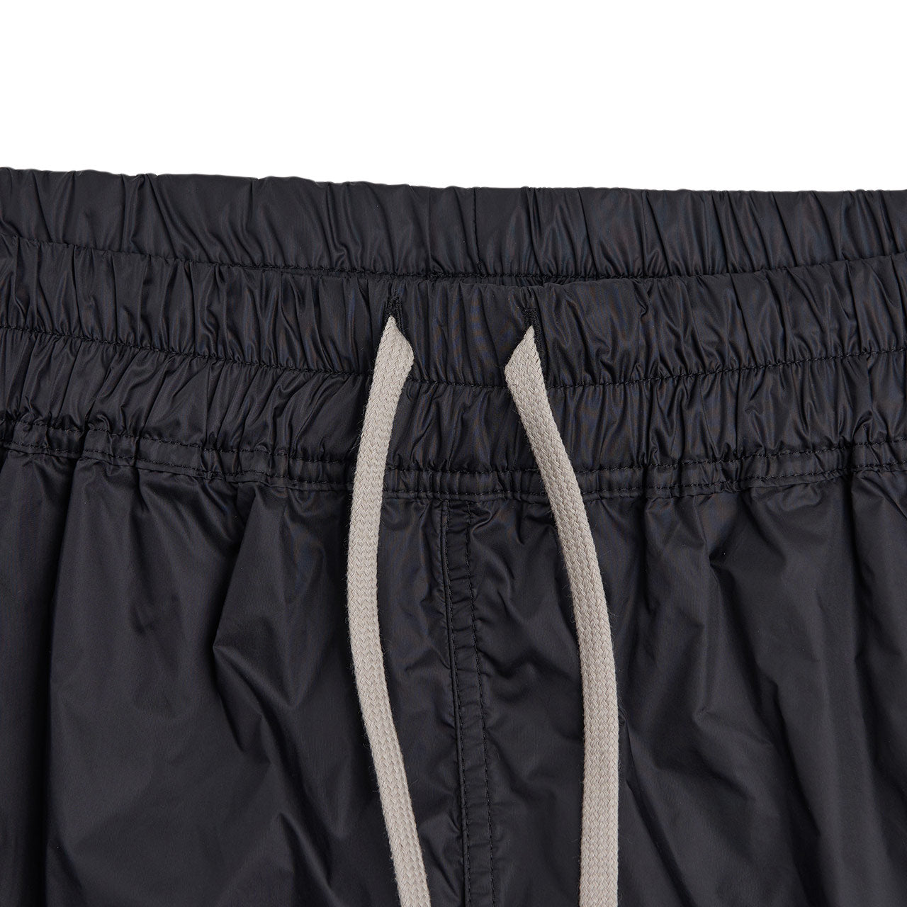 these shorts from the ss23 rick owens drkshdw collection have an elastic waistband with drawstrings. the shorts are featuring a split on the right side and pockets on each side.