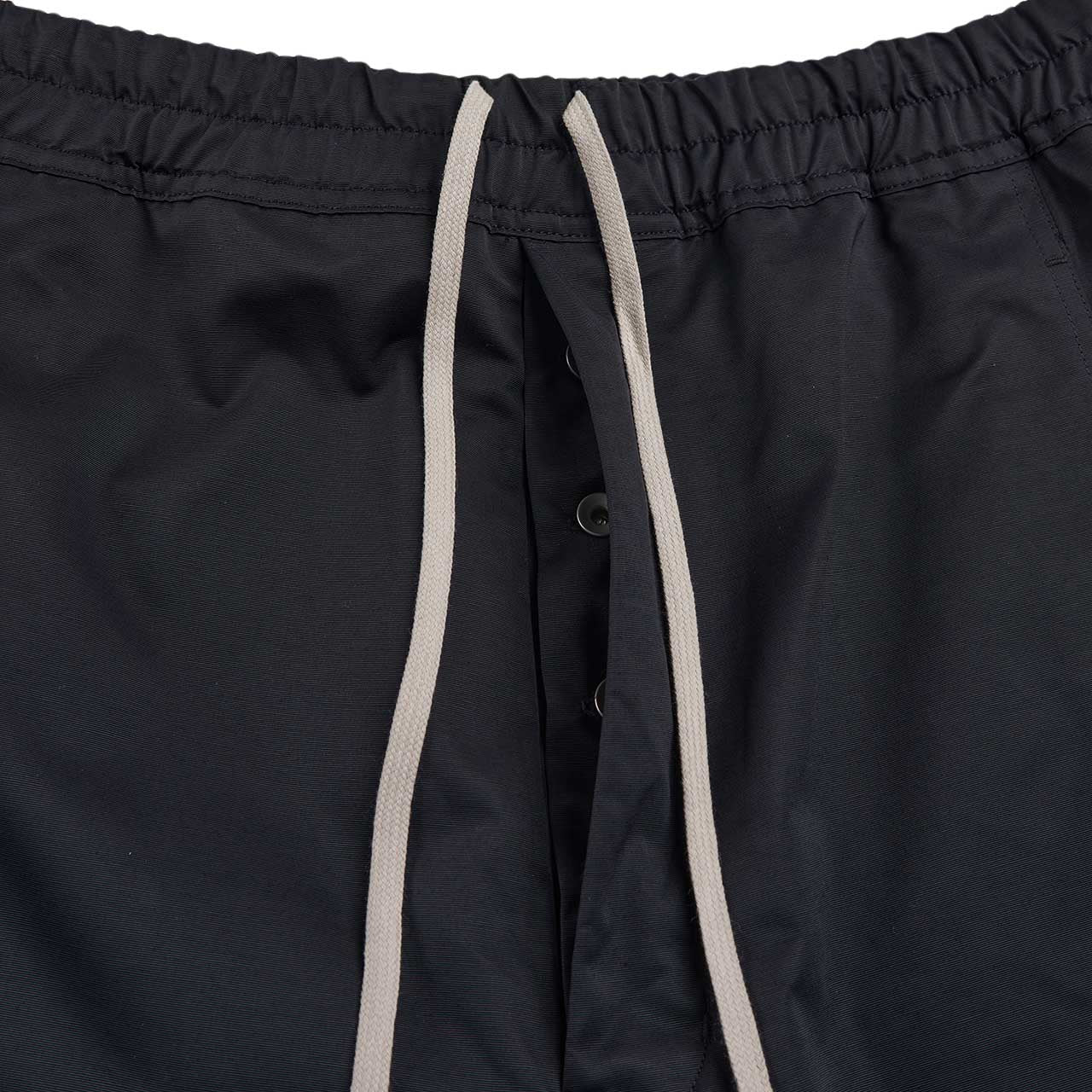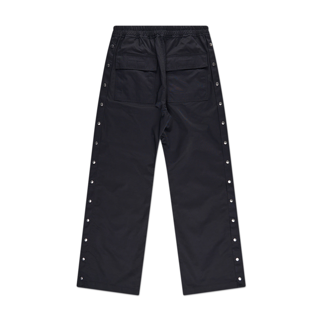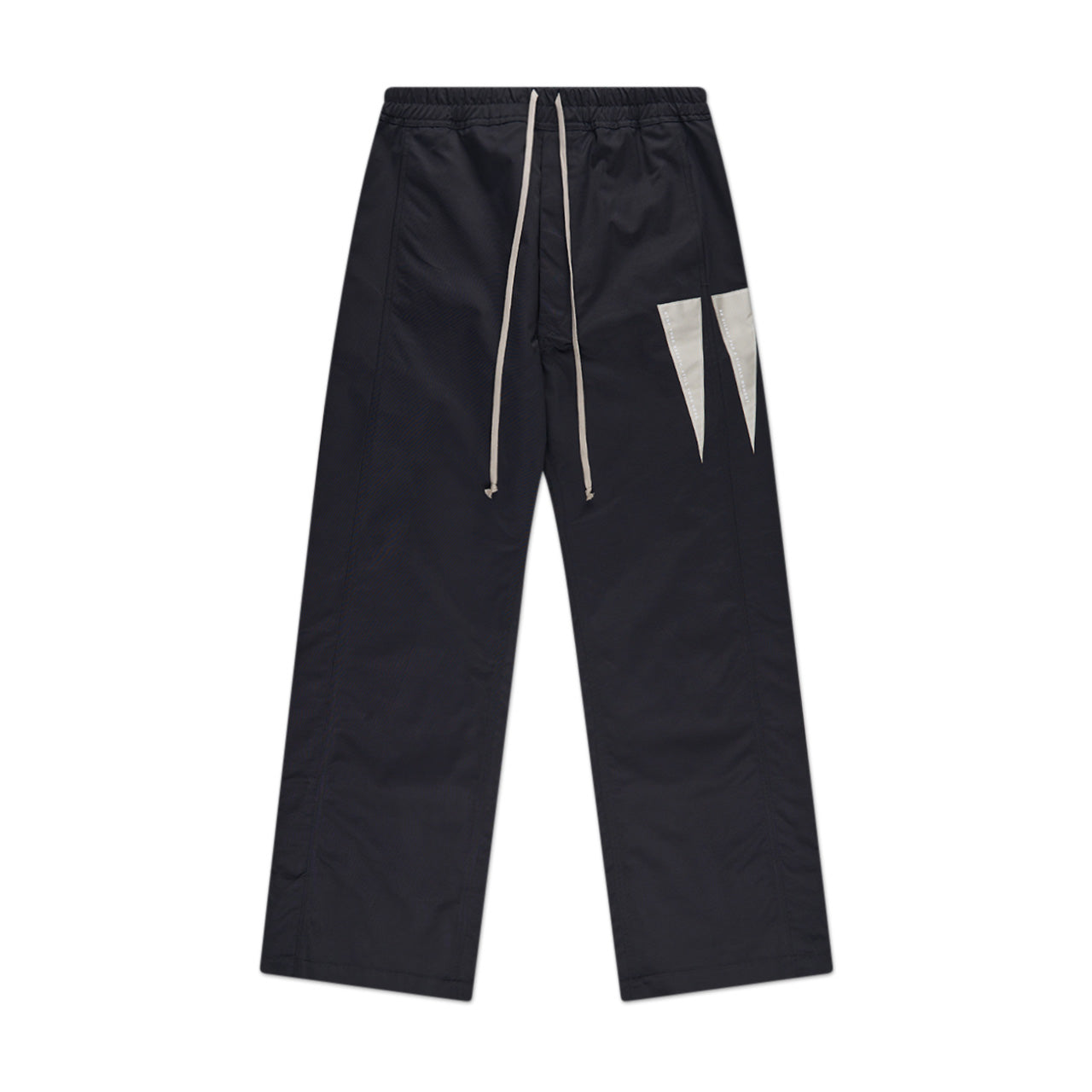 these pants from the ss23 rick owens drkshdw collection have an elastic waistband with drawstrings. the pants have two pockets with hook and loop closure on the back and two pockets on the front. also the pants are featuring a snap closure on each side of the legs and the iconic triangle detail.