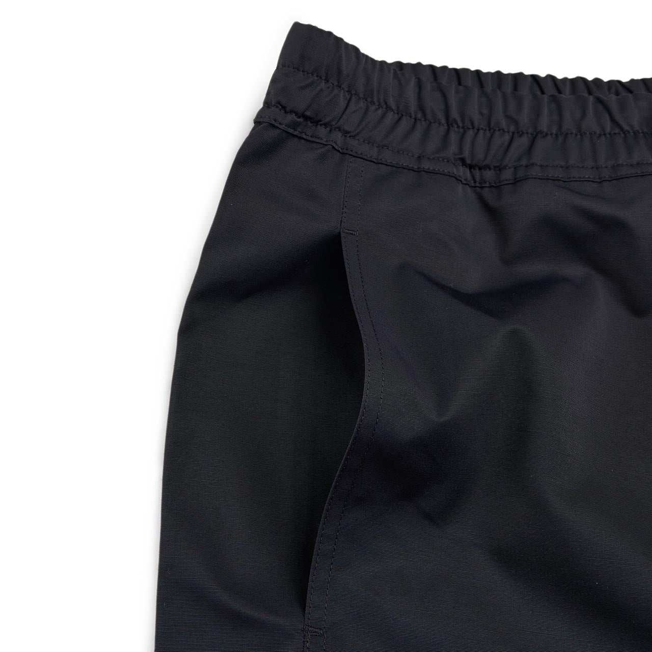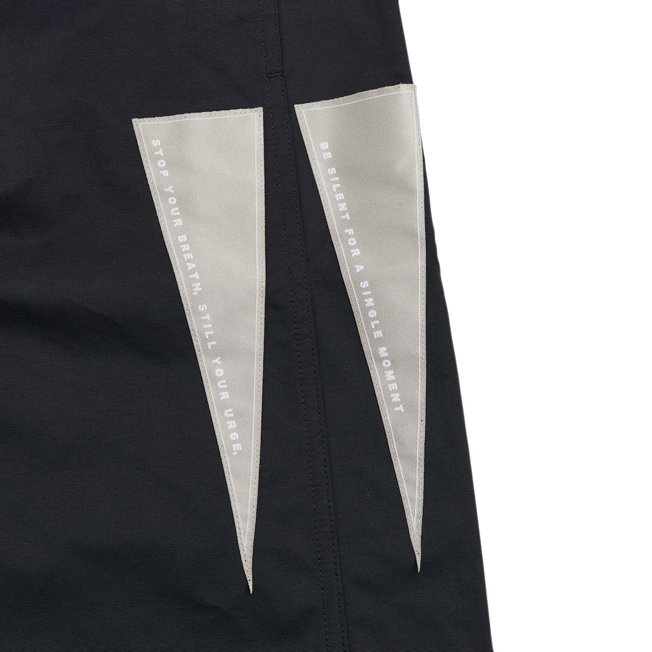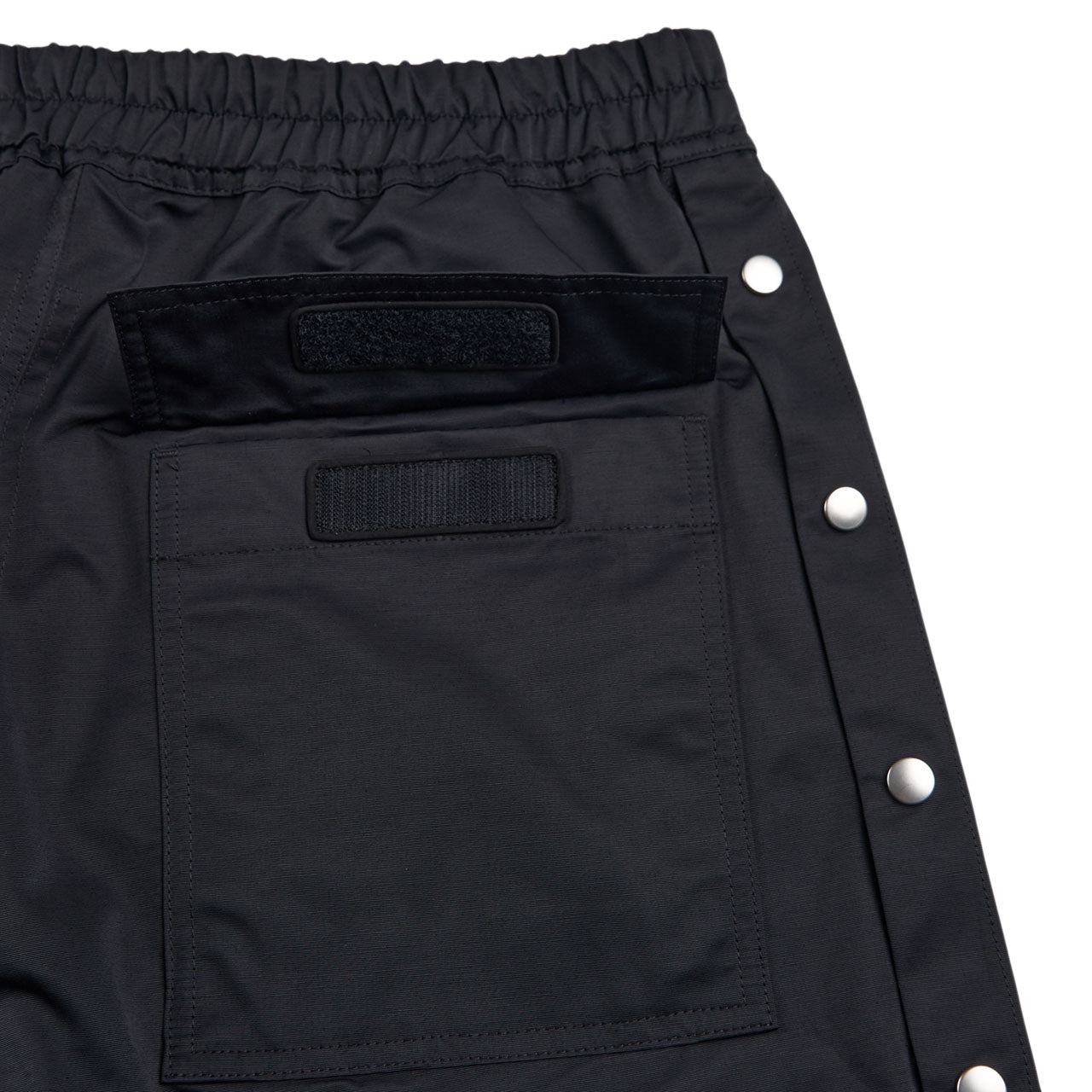 these pants from the ss23 rick owens drkshdw collection have an elastic waistband with drawstrings. the pants have two pockets with hook and loop closure on the back and two pockets on the front. also the pants are featuring a snap closure on each side of the legs and the iconic triangle detail.