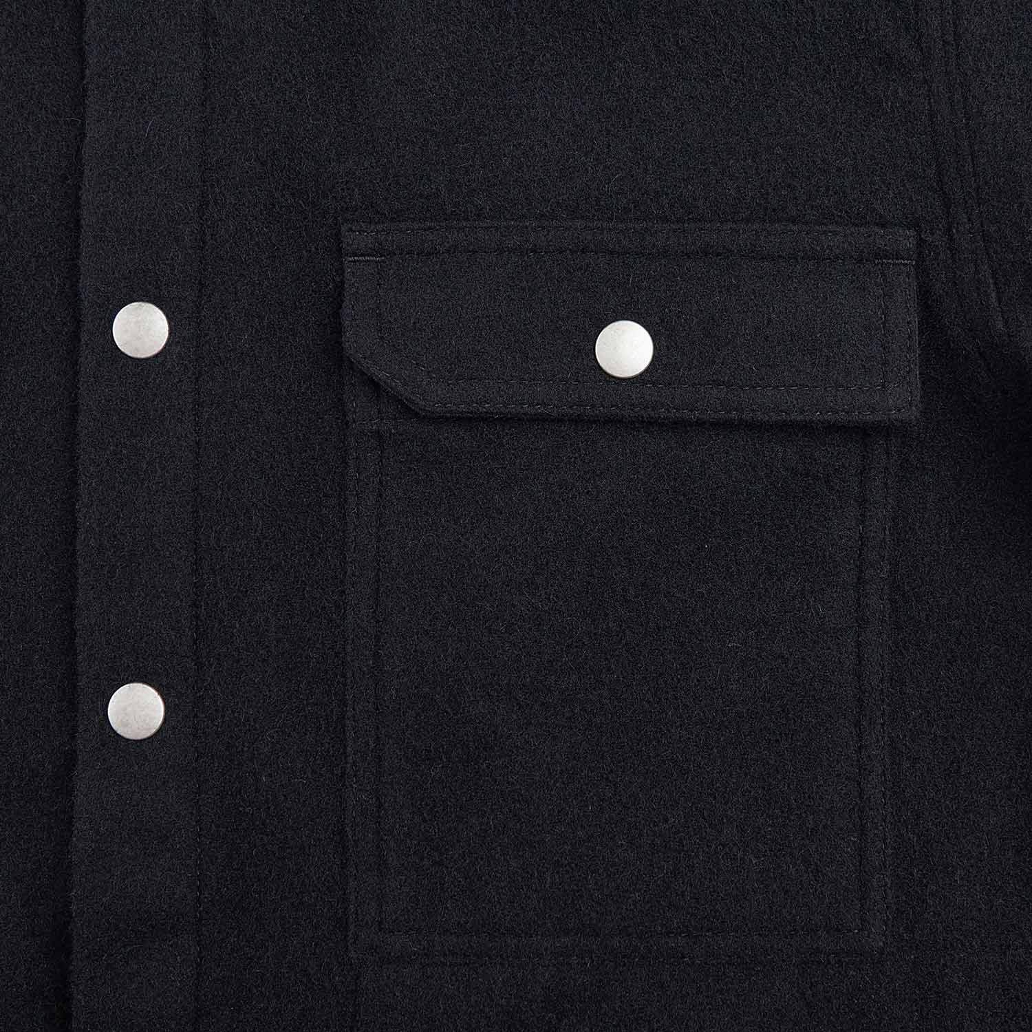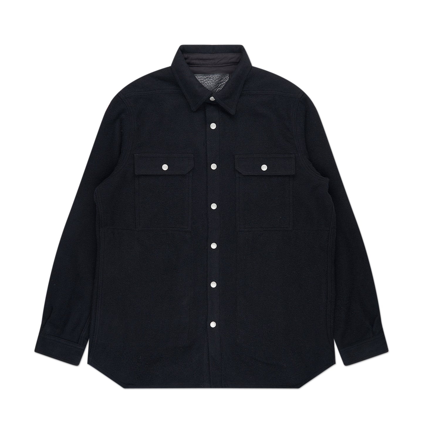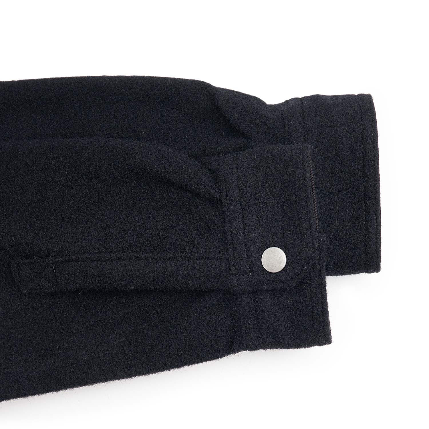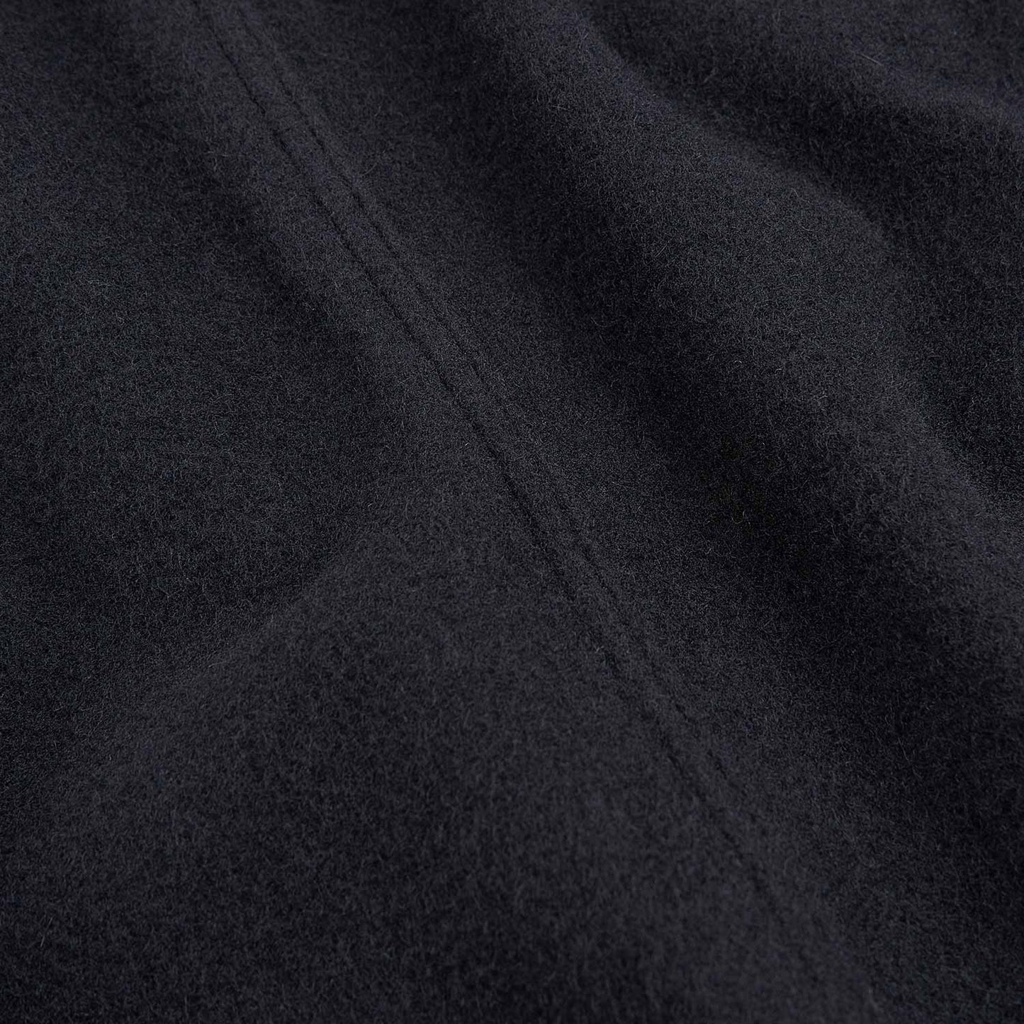 wool jacket from the rick owens fall / winter 23 collection. the jacket is featuring a pointed collar, a placket on front with button closure and buttoned flap pockets on the chest.