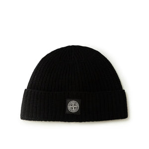 classic stone island ribbed beanie in a black colorway featuring iconic logo on the front