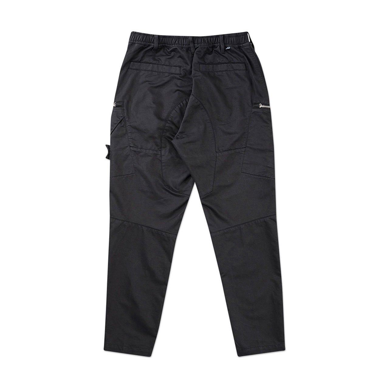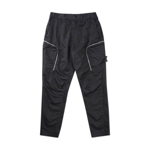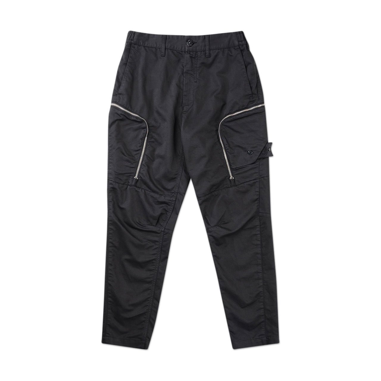 garment dyed cargo pants made of cotton satin. slanting hand pockets and two slit pockets on back. additional pocket on both legs, with two-way zipper fastenings. stone island shadow project badge half way hidden under flap in the left pocket. shaped knees and button and zip fly.