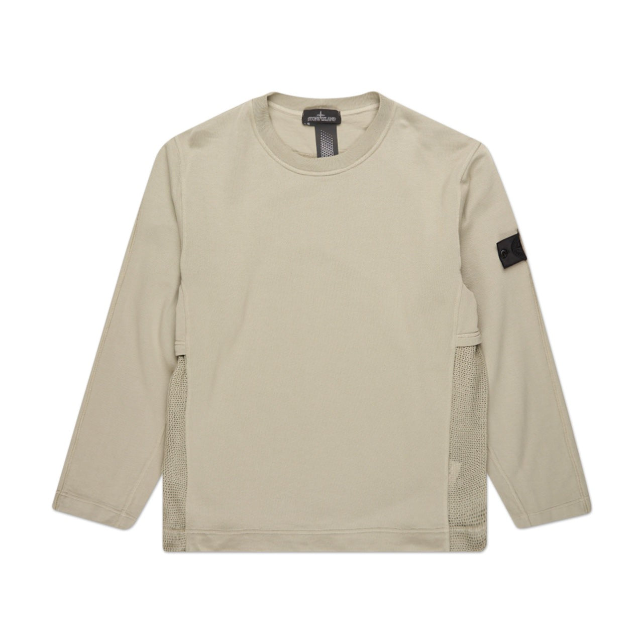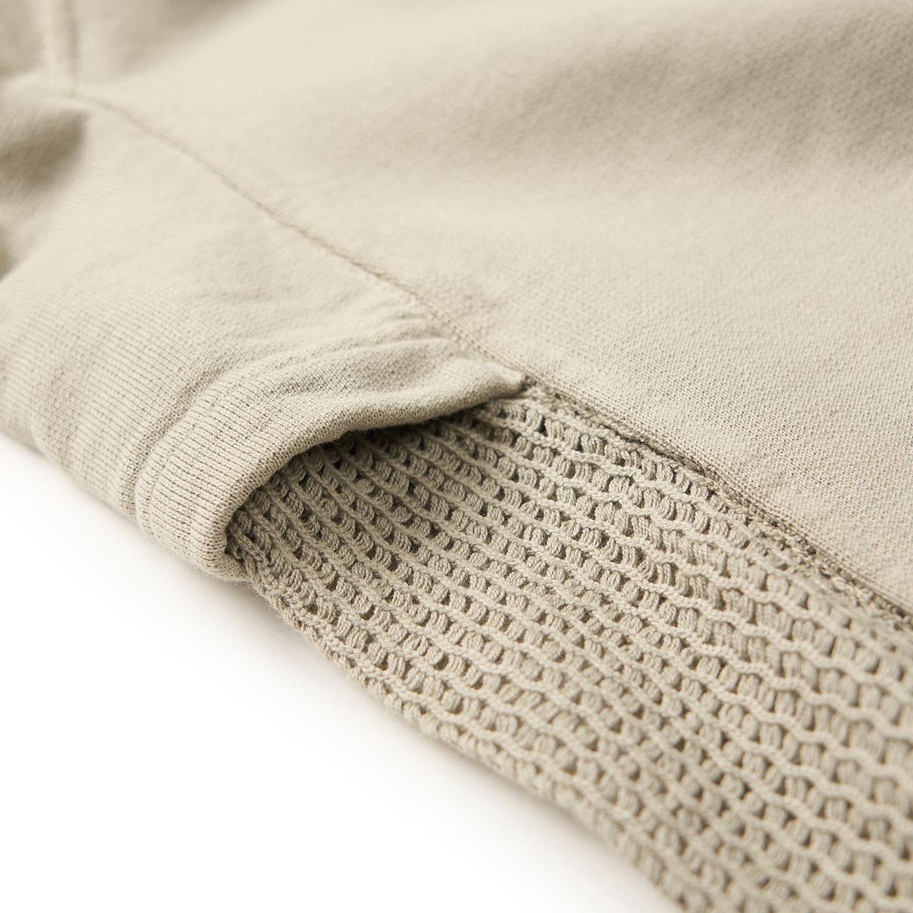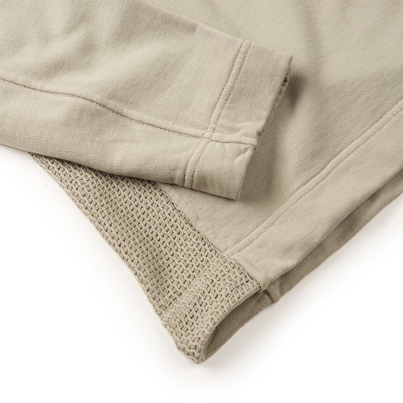 sweatshirt from stone island's latest shadow project collection. the sweater features a mesh panel on each side, showing off the layer worn beneath the hoodie. features the iconic, half hidden shadow project badge.